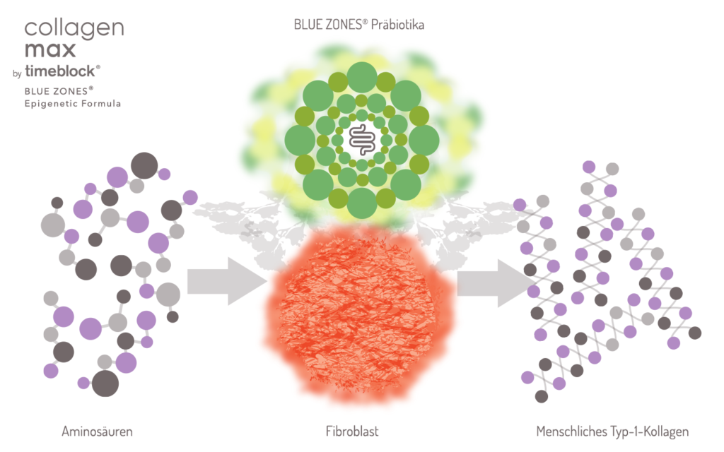 VeCollal® ist mit dem menschlichen Typ-1-Kollagen identisch und liefert die perfekten Verhältnisse für den natürlichen Kollagenaufbau im Körper. Es basiert auf dem natürlichen Syntheseprozess des menschlichen Typ-1-Kollagens. Keine tierische Kollagenquelle hat diese Eigenschaft. Nur VeCollal® kann dank eines patentierten Verfahrens das menschliche Typ-1-Kollagen perfekt nachbauen. Die Wirkung von VeCollal® wird durch die epigenetische Formel von BLUEZONES® enorm optimiert. Das 3-PHASEN-SYSTEM von timeblock collagenmax steigert die körpereigene Produktion von Kollagen und Elastin. Das 3-PHASEN-SYSTEM von timeblock collagenmax regt den Körper dazu an, die perfekte Versorgung mit Aminosäurebausteinen zu liefern – für eine maximale Kollagenproduktion wie bei jungen Menschen.